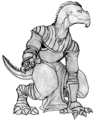 Absorption: 0 Cover: 0Natural Weapons Reach: 0.9 m (36 inches) Heft: 0 Sharpness: -2PPV: 23 In many ways Basilisks are typical primitive dinosaurs - distantly related to many different types of dinosaurs - but they have some distinctive advanced characteristics. They have large brains, a more vertical posture and shorter tail to keep the head balanced near the center of gravity. Basilisks are very fast runners with long legs and three toes on each foot. They have four-fingered grasping hands with a strong opposing thumb and strong arms allowing them to use tools and weapons quite effectively. Small paired horns on the chin and a thin crest running from the head all the way down the length of the spine seem to have no function beyond display and identification. The Basilisk voice is somewhat low pitched, and their languages tend to use slow, monotone, simple syllables that their mouths and vocal cords can handle. Some of the words in these languages are pronounced using body parts other than the mouth, like hand clapping for example. Basilisks have a strong sense of smell, and so their conversation often takes this for granted. (For example, a Basilisk may assume that it's obvious exactly what is cooking, when other anthrosaurs may be guessing in spite of what they can smell.) For defense, the Basilisks can rely on their speed and either the simple claws on their hands and feet or artificial weapons. Males have a decorative row of short spines that extend from the top of their heads, down their spines, to the tips of their tails. Copyright © 1997 - 2003 Seth Galbraith and Benjamin Galbraith |
